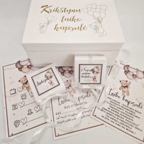 Krikštynų svečių pasižadėjimai, linkėjimai, profesijos spėjimo kortelės (dėžutėse)