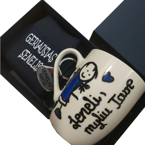 Rinkinys seneliui kojinės, puodelis kepurė ir dėžutė