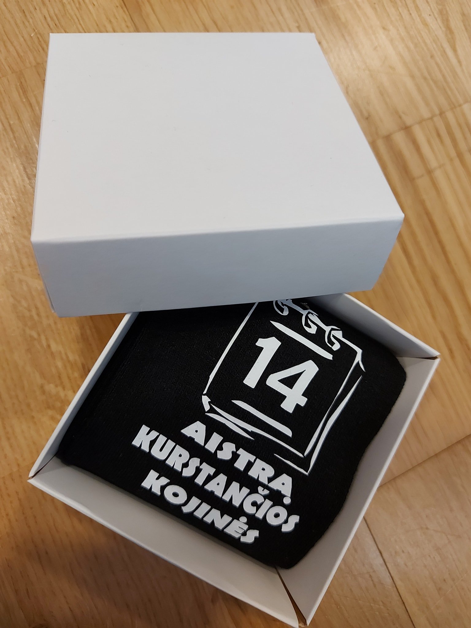 Kojinės supakuotos dovanų dėžutėje.