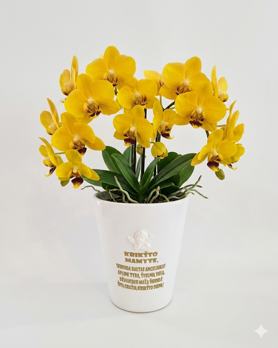 Nuostabi dovana krikšto mamytei, dekoruotas angeliuku. Vazonas parduodamas be orchidėjos.
