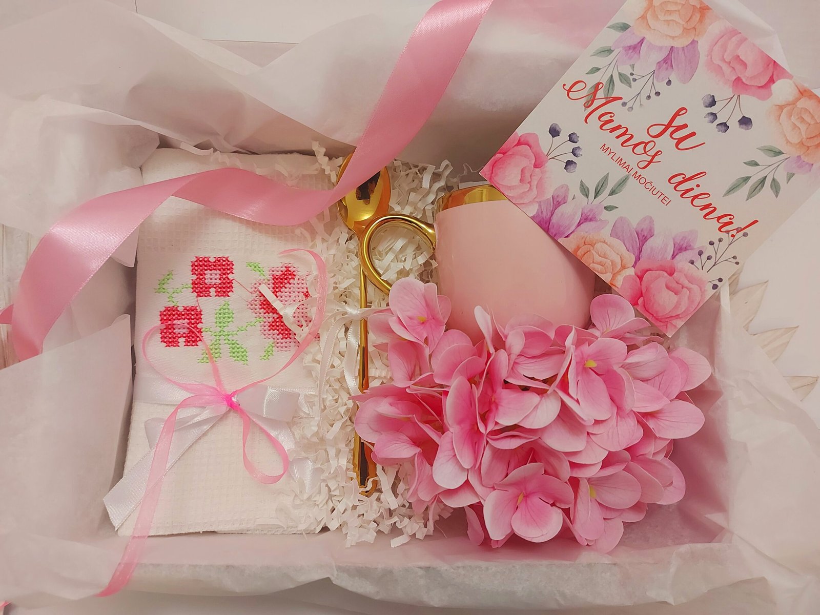 Rinkinį sudaro: siuvinėtas virtuvės rakšluostukas 62x43cm, rožinis puodelis su prabangia auksine rankenėle, aukso spalvos šaukštelis bei itin kokybiškas dirbtinės gėlės žiedas.