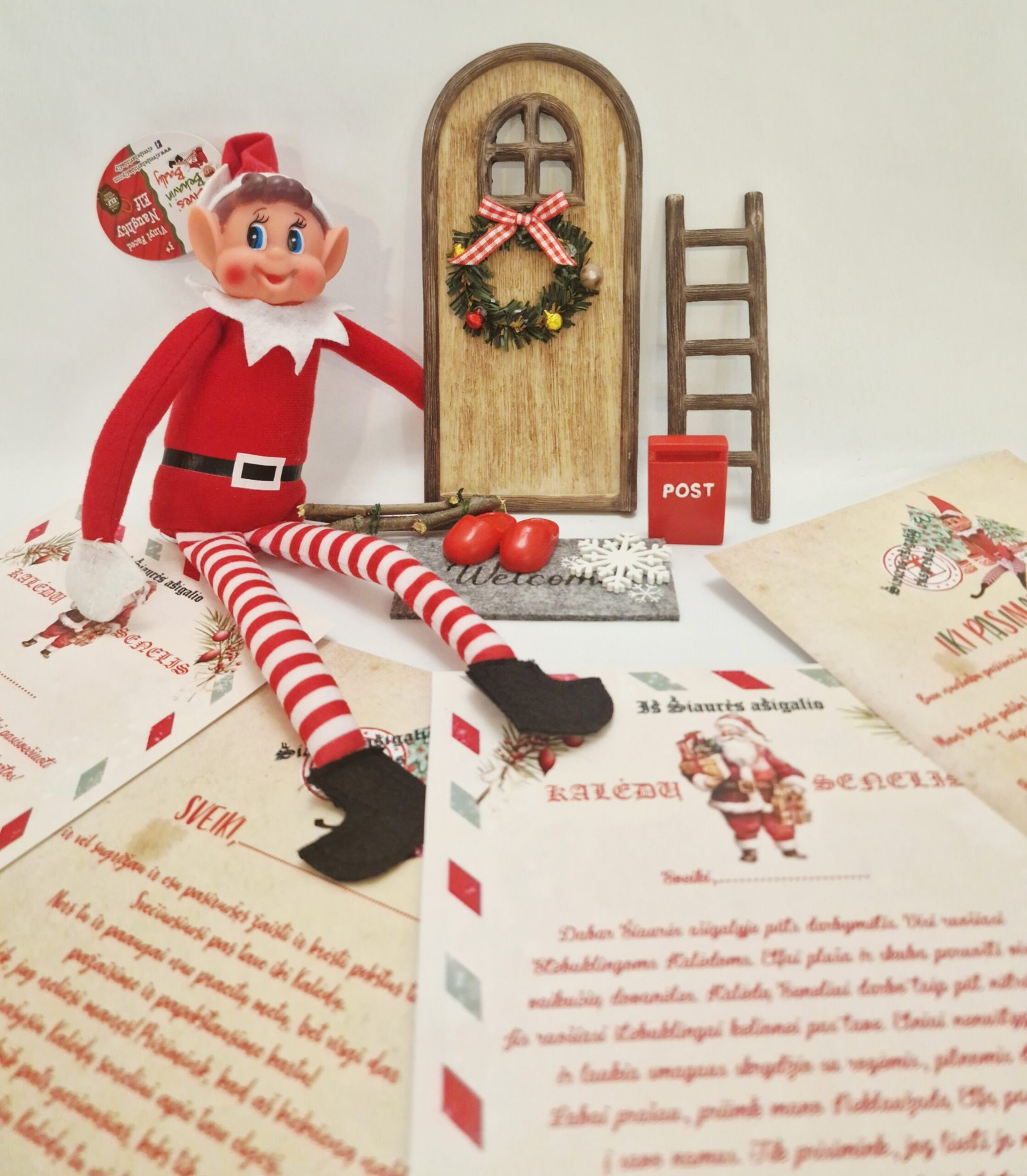Rinkinį sudaro neklaužada ELFAS, durelės, durų kilimėlis, dekoratyvinė snaigė, pašto dėžutė kopėčios bei malkų ryšulėlis, Kalėdų senelio bei elfo pasisveikinimo ir atsisveikinimo laiškai.
