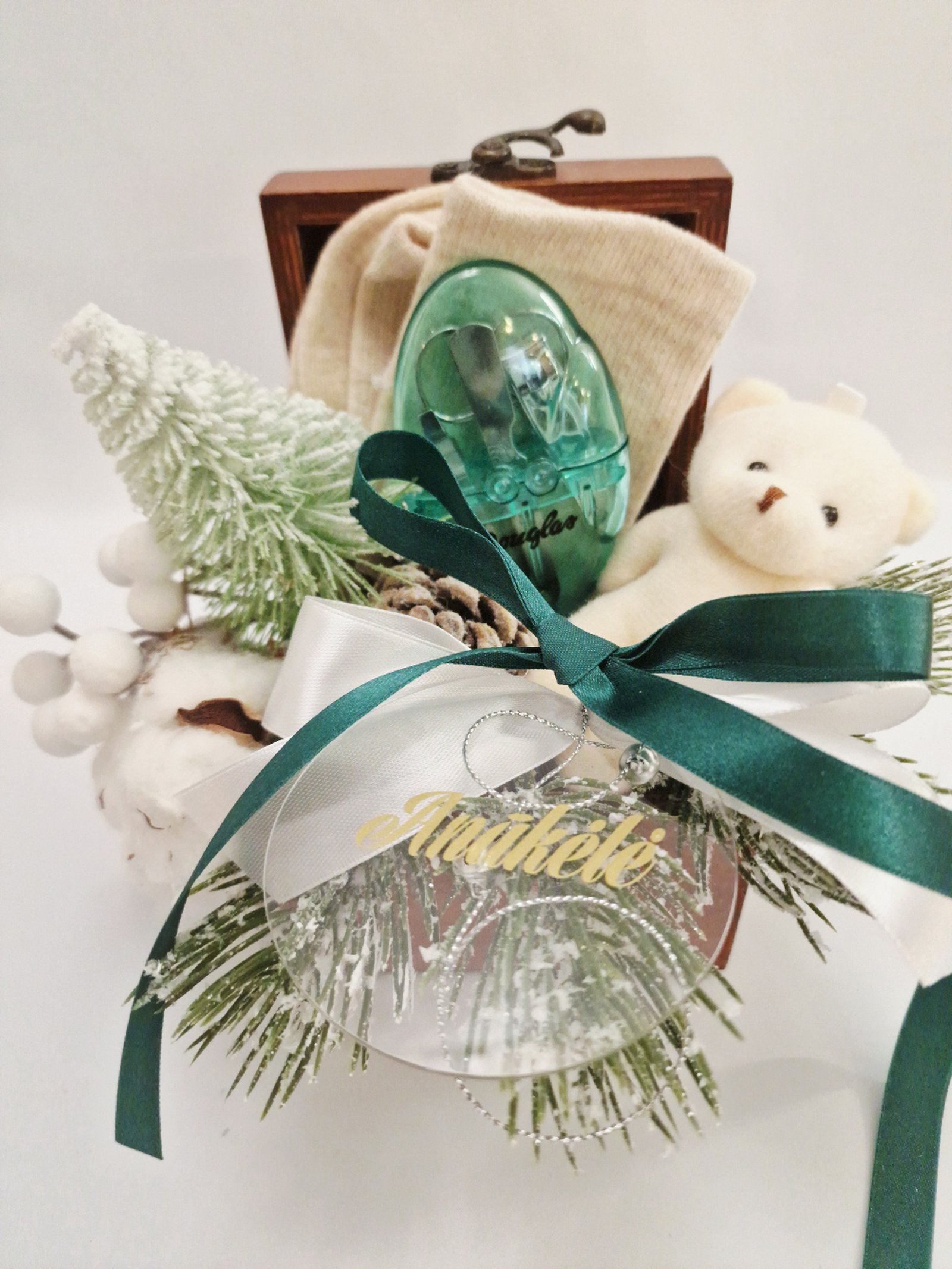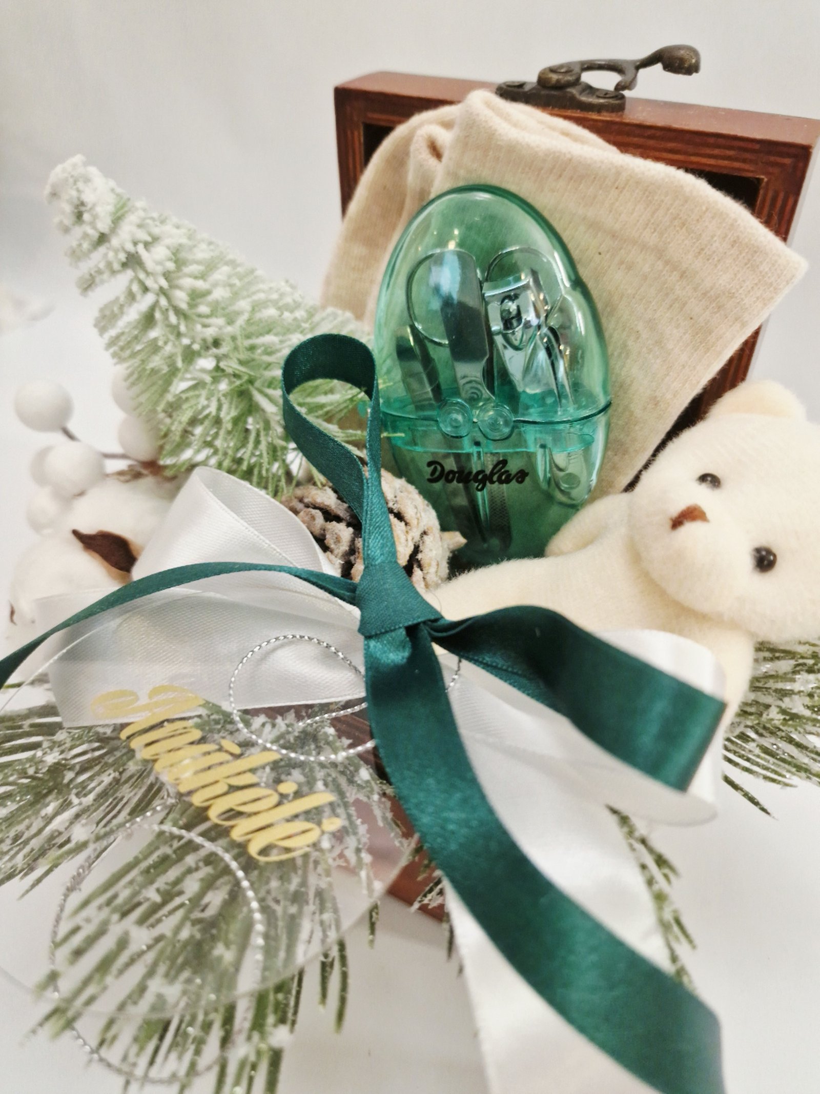 Jį sudaro medinė dėžutė, meškutis, kojinaitės, nagų priežiūros rinkinukas ir dekoratyvinės eglutės šakelės.