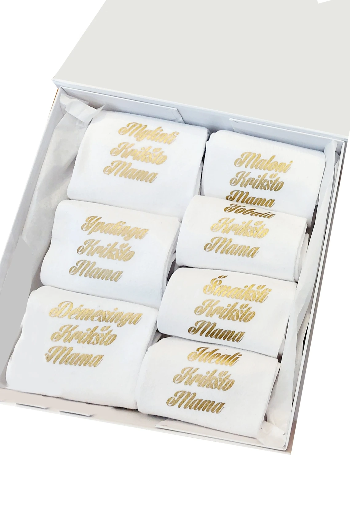 Septynios kojinių poros su užrašais popierinėje dėžutėje.