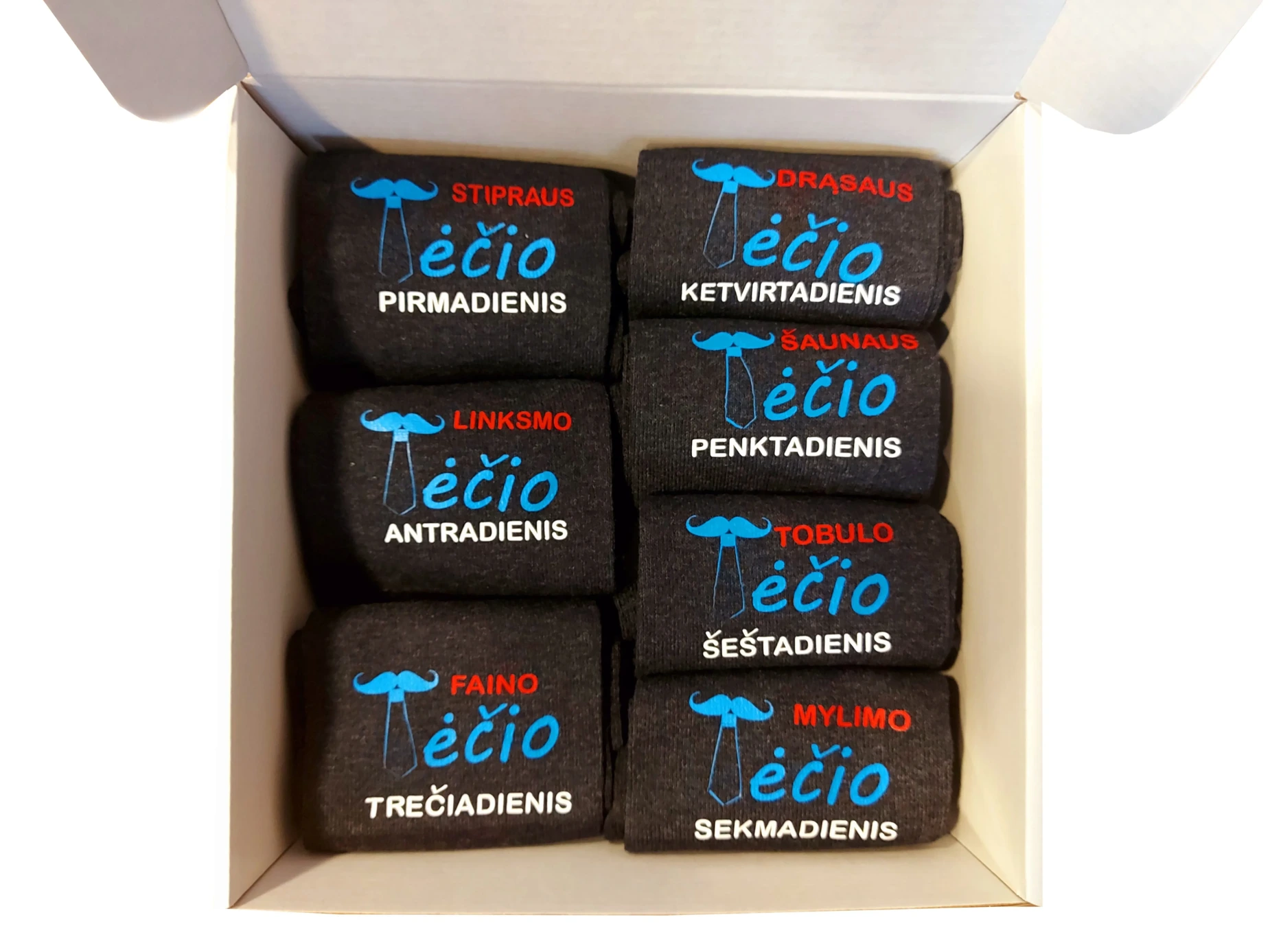 Septynios kojinių poros su užrašais popierinėje dėžutėje.