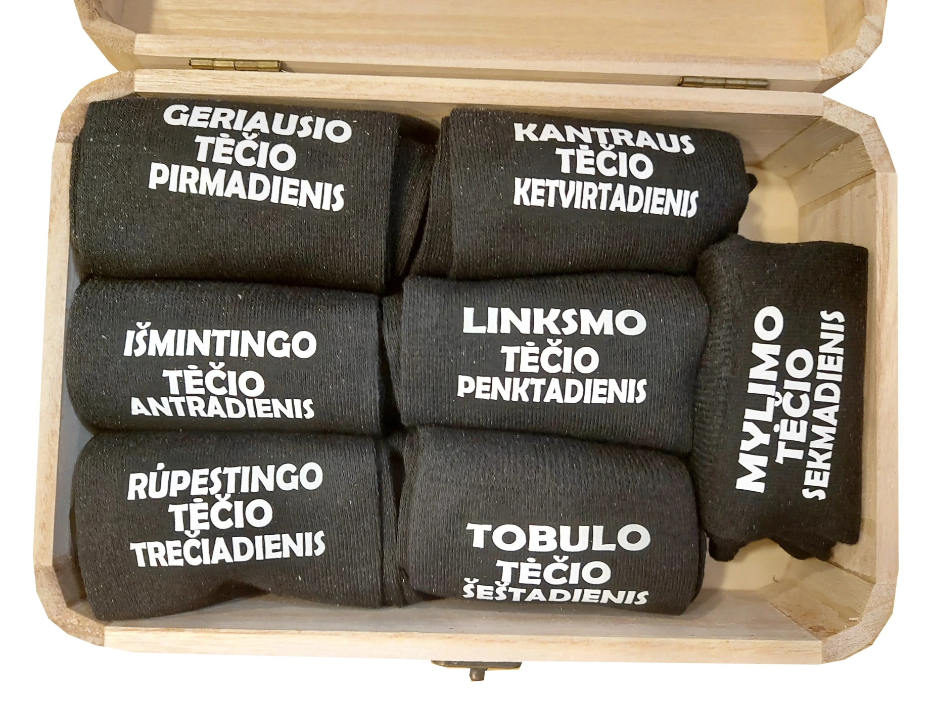 Septynios kojinių poros su užrašais medinėje dėžutėje.