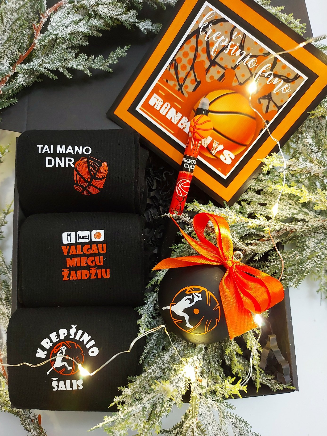 Rinkinį sudaro trejos kojinės 43-45d., rašiklis krepšinio tematika ir kalėdinis žaisliukas.