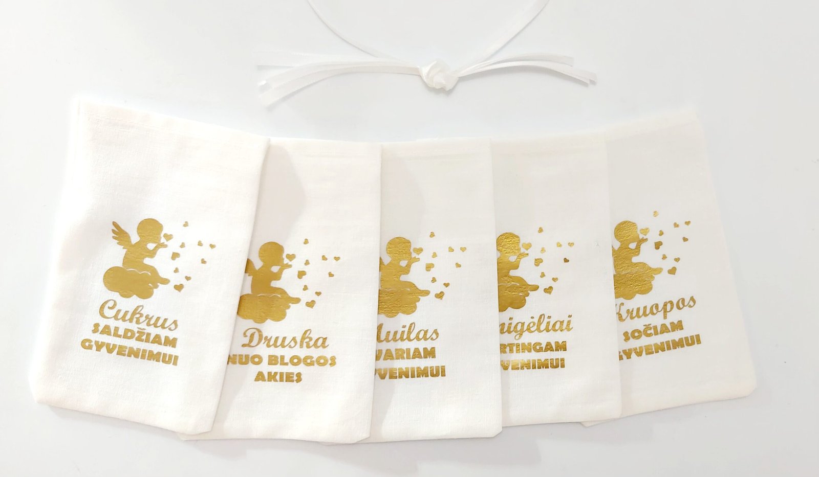 Krikštynų maišeliai. Rinkinį sudaro 5 maišeliai su užrašais ir užrišimais.Maišeliai yra skirti