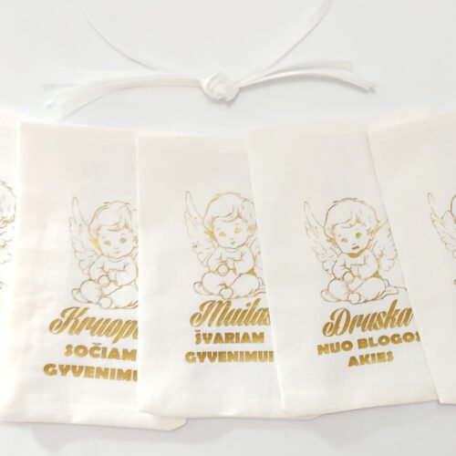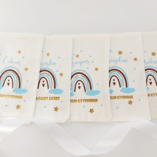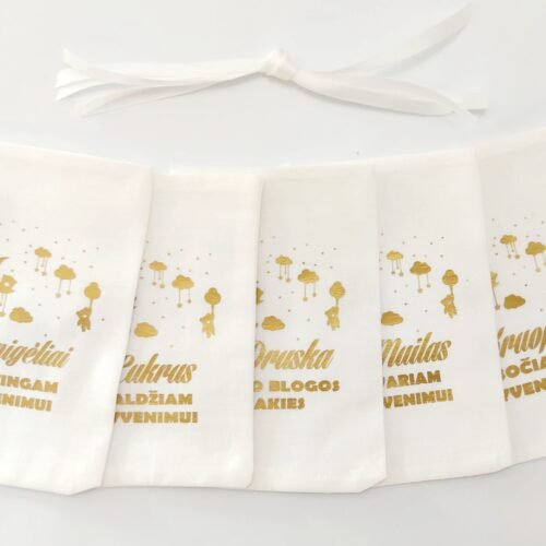 Krikštynų maišeliai. Rinkinį sudaro 5 maišeliai su užrašais ir užrišimais.Maišeliai yra skirti