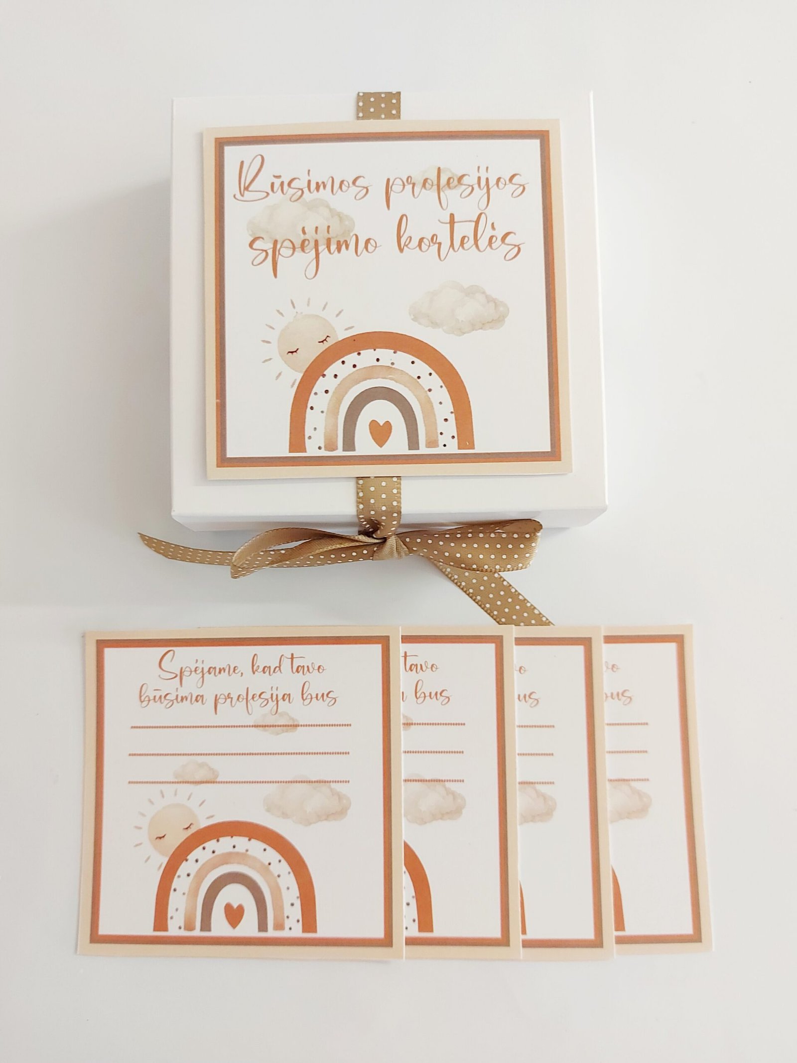 Dėžutė su kortelėmis „Krikštynų pasižadėjimai ” Dėžutės dydis 10.5 x 10,5 x 5 cm. Dėžutėje yra 24 vnt kortelių. Atsiliepimai Atsiliepimų dar nėra. Būkite pirmas aprašęs “Krikštynų būsimos profesijos spėjimo kortelės AUKSINĖ VAIVORYKŠTĖ” Cancel ReplyEl. pašto adresas nebus skelbiamas. Būtini laukeliai pažymėti *Jūsų įvertinimas * Įvertinti… Puikus Geras Vidutinis Patenkinamas Niekam tikęs Name *Email *Jūsų atsiliepimas * Noriu savo interneto naršyklėje išsaugoti vardą, el. pašto adresą ir interneto puslapį, kad jų nebereiktų įvesti iš naujo, kai kitą kartą vėl norėsiu parašyti komentarą. Paskelbti