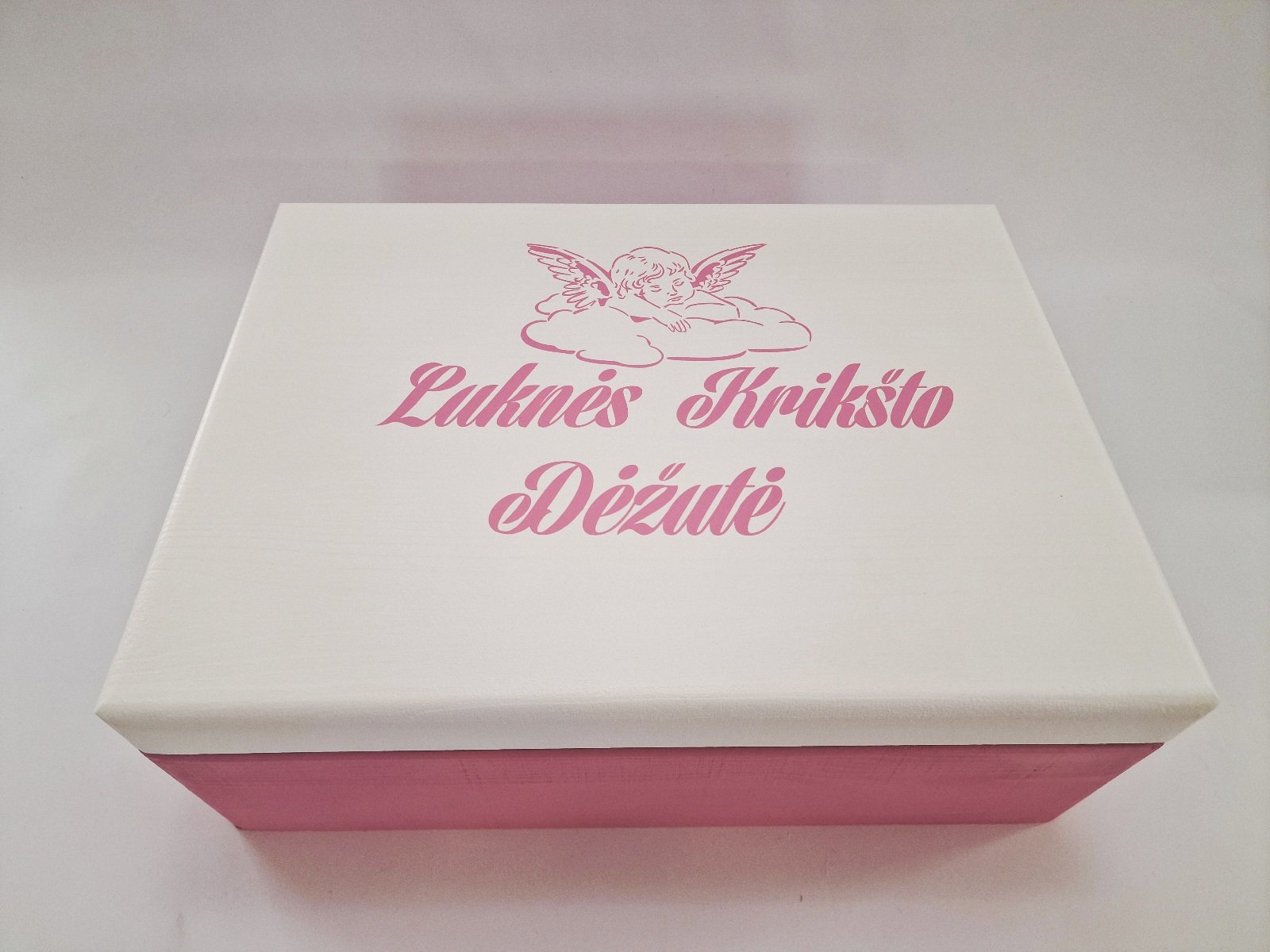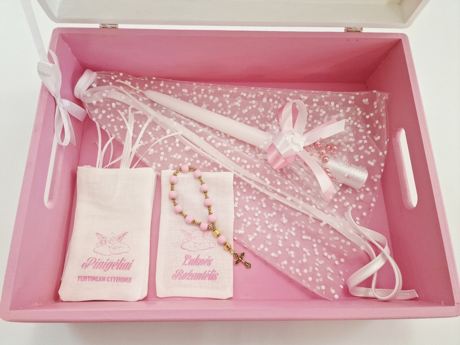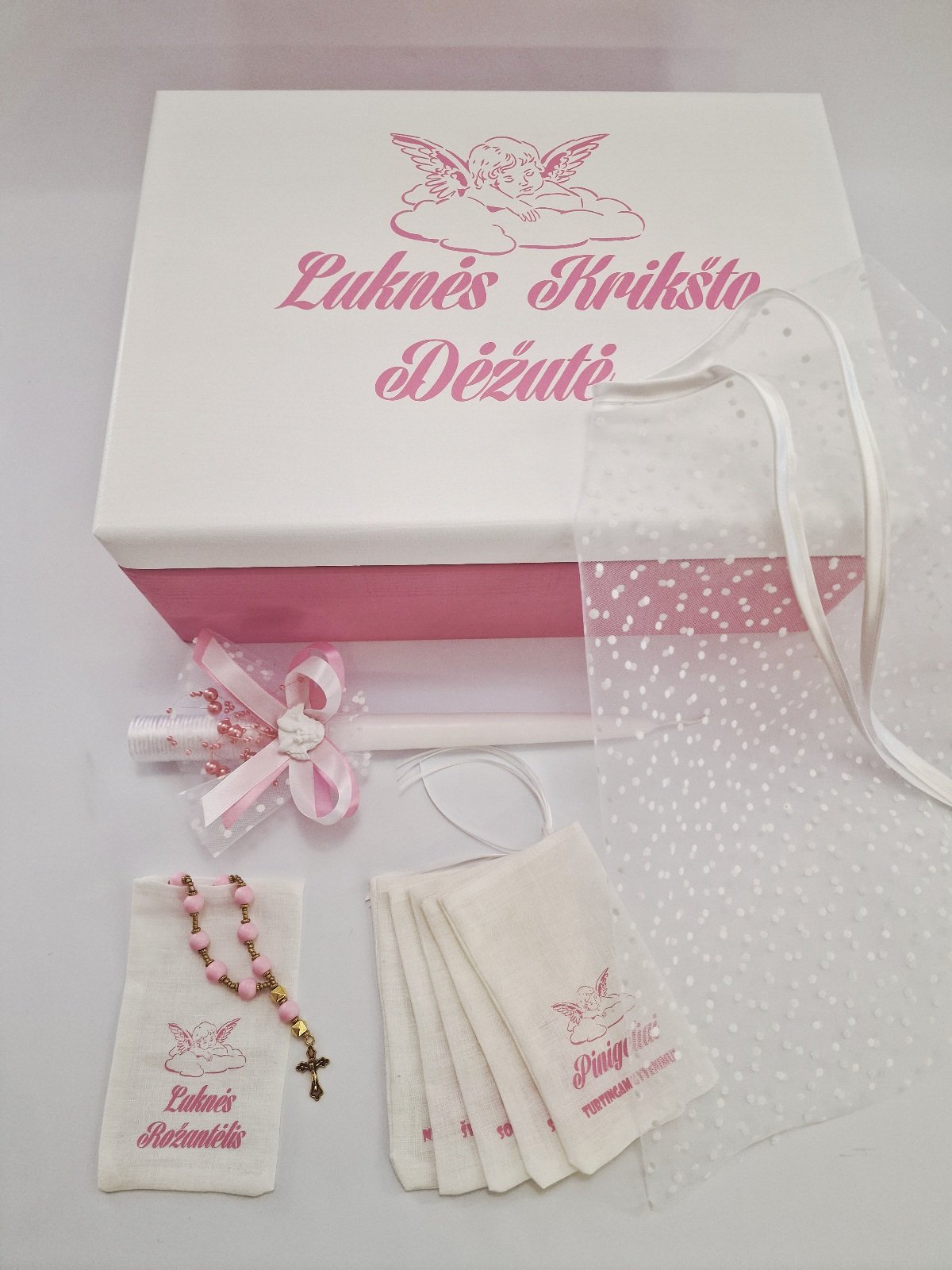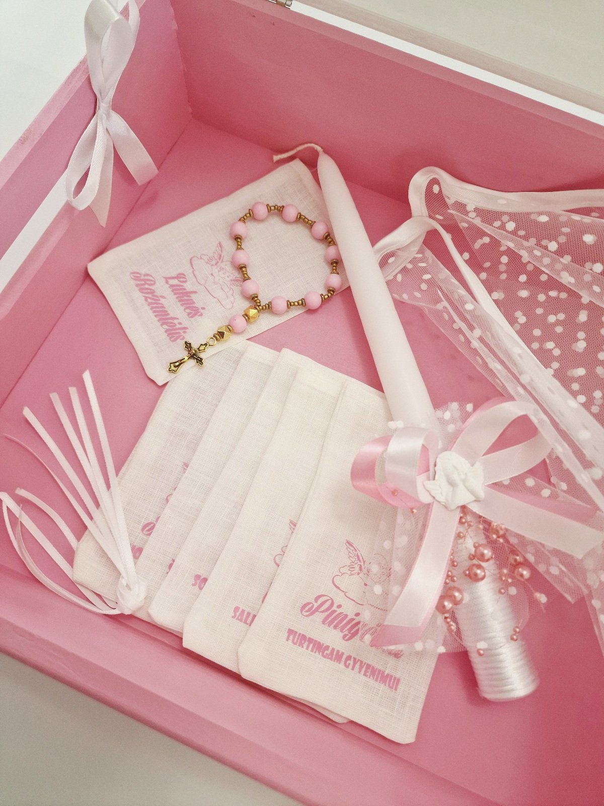 Krikštynų rinkinį sudaro: medinė krikšto dėžutė (galite rinktis dydį), krikšto žvakė, krikštynų maišeliai, krikšto skraistė bei vienos dalies rožantėlis maišelyje.