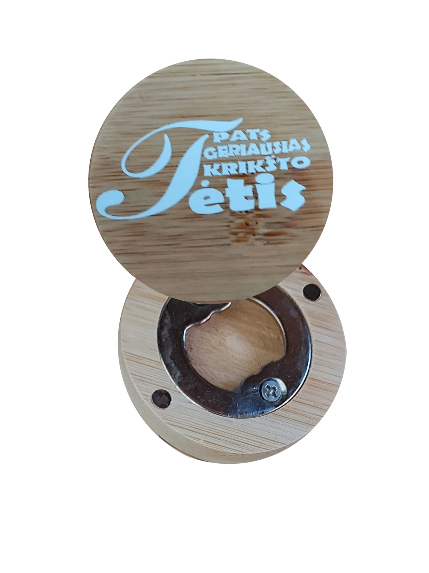 Medinis magnetukas – atidarytuvas,puiki simbolinė dovana. Medinis magnetukas- atidarytuvas skersmuo 6cm.