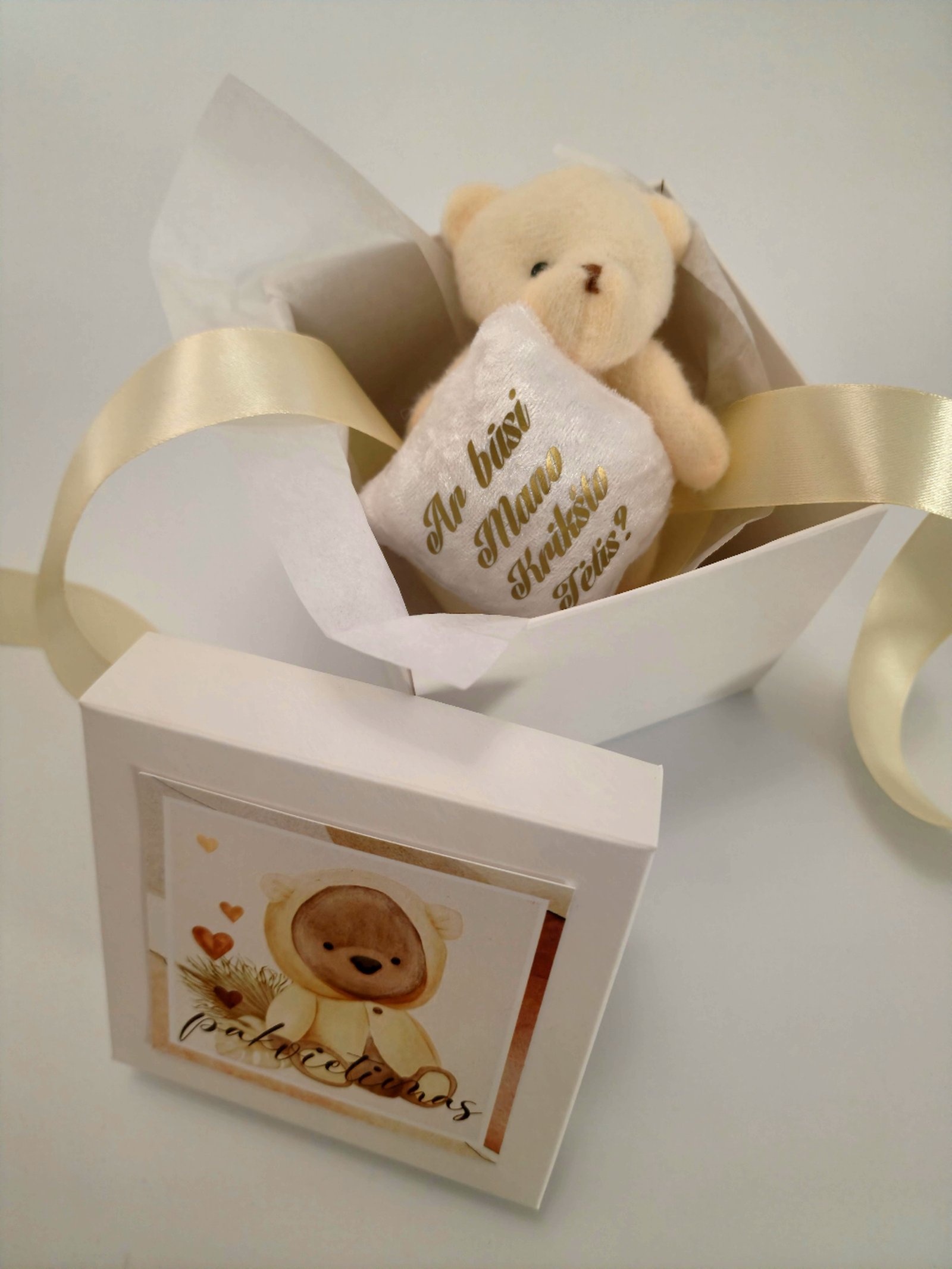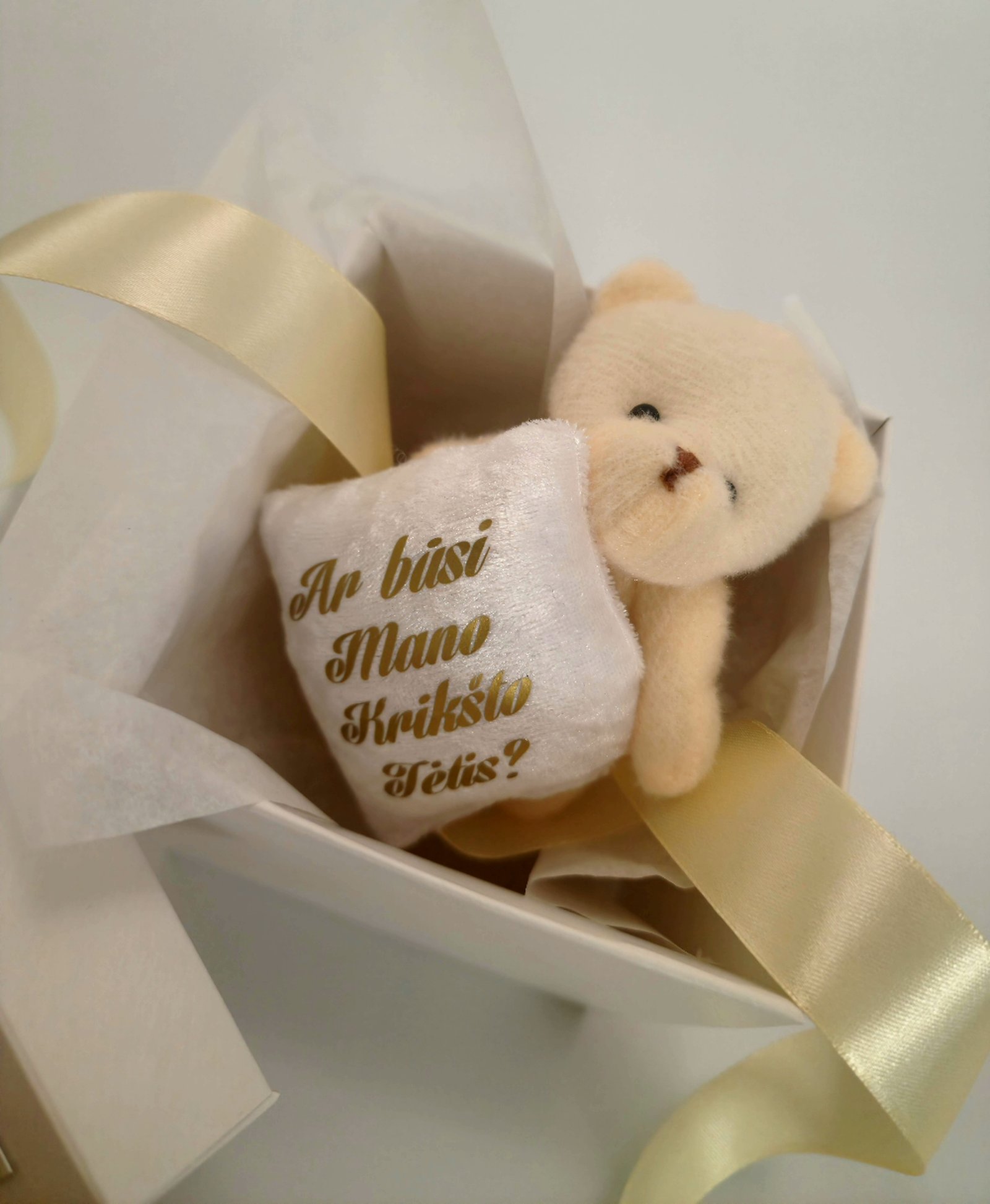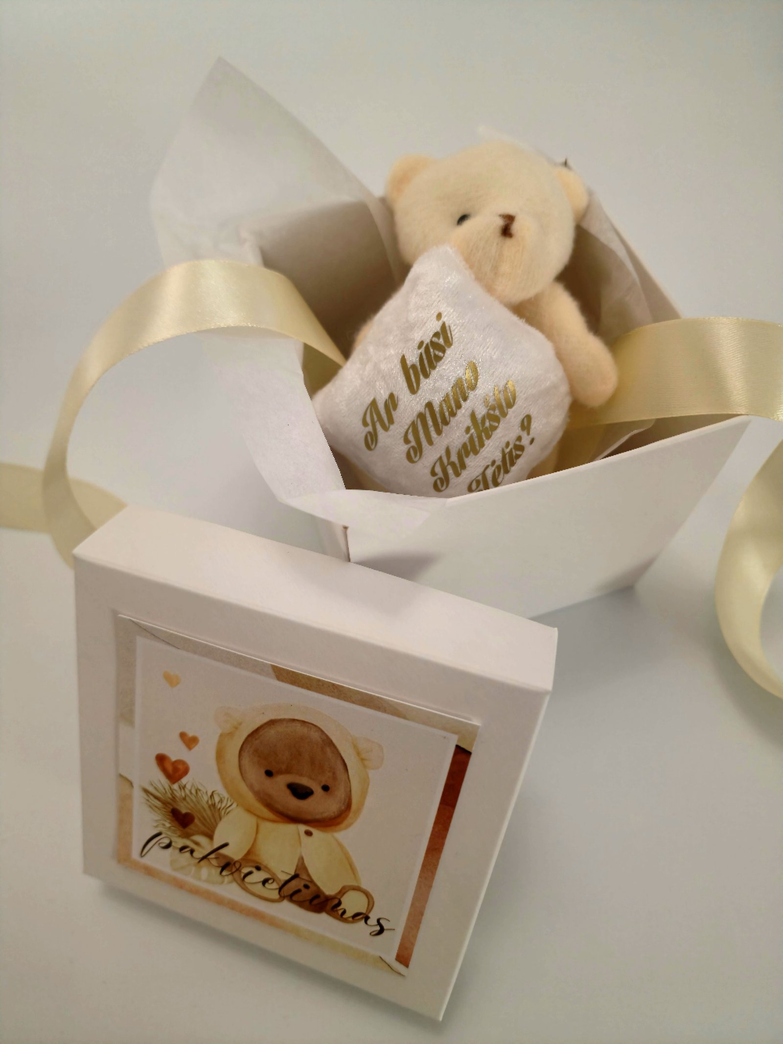 Rinkinį sudaro dėžutė su pakvietimu „Ar būsi mano Krikšto tėtis?”,10x10x10cm dydžio ir meškutissu pagalvėle.
