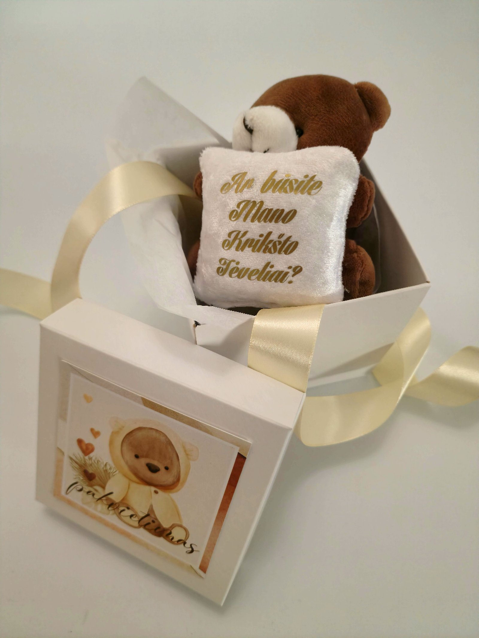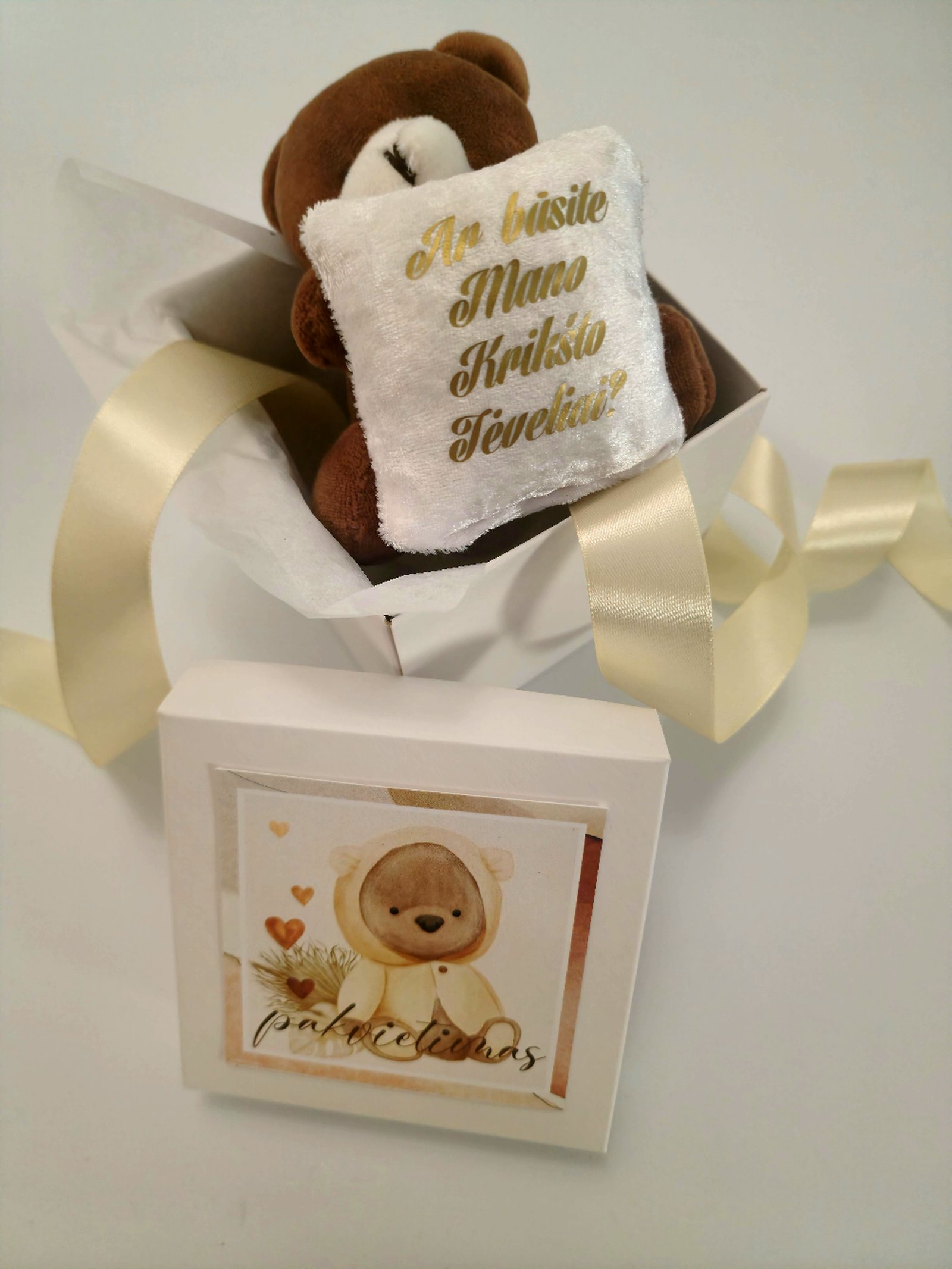 Rinkinį sudaro dėžutė su pakvietimu „Ar būsite mano Krikšto tėveliai?”,10x10x10cm dydžio ir meškutis su pagalvėle. Atsiliepimai Atsiliepimų dar nėra. Būkite pirmas aprašęs “Pakvietimas Krikšto tėveliams” Cancel ReplyEl. pašto adresas nebus skelbiamas. Būtini laukeliai pažymėti *Jūsų įvertinimas * Įvertinti… Puikus Geras Vidutinis Patenkinamas Niekam tikęs Name *Email *Jūsų atsiliepimas * Noriu savo interneto naršyklėje išsaugoti vardą, el. pašto adresą ir interneto puslapį, kad jų nebereiktų įvesti iš naujo, kai kitą kartą vėl norėsiu parašyti komentarą. Paskelbti