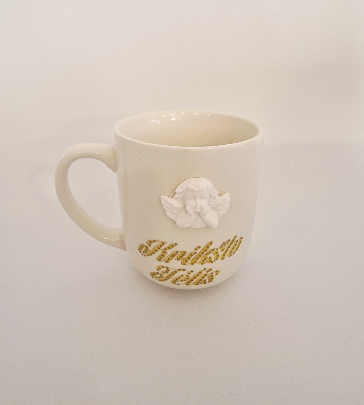 puodelis dekoruotas iškiliu baltu angeliuku.