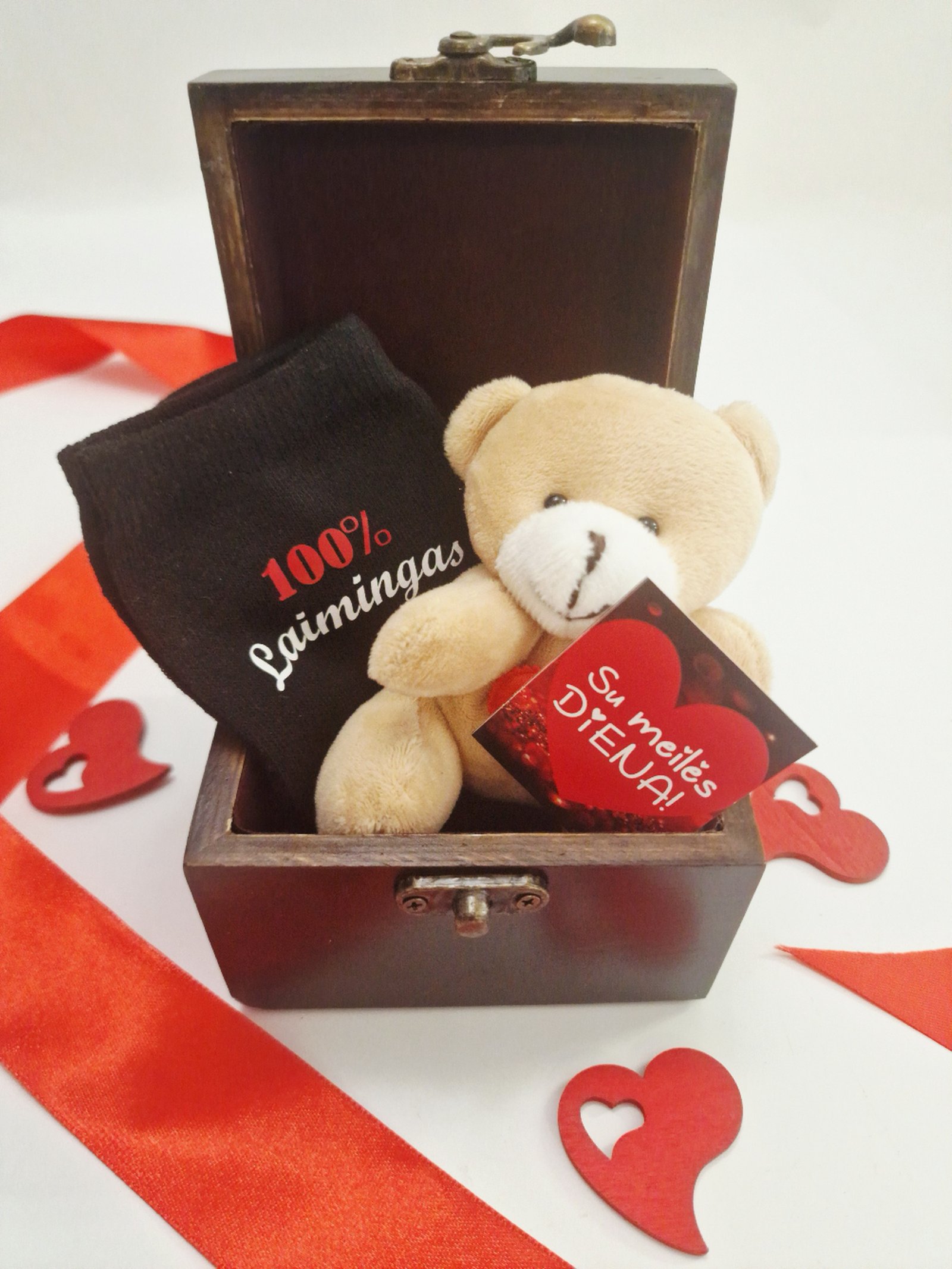 Rinkinį sudaro medinė skrynelė, meškutis bei kojinės.