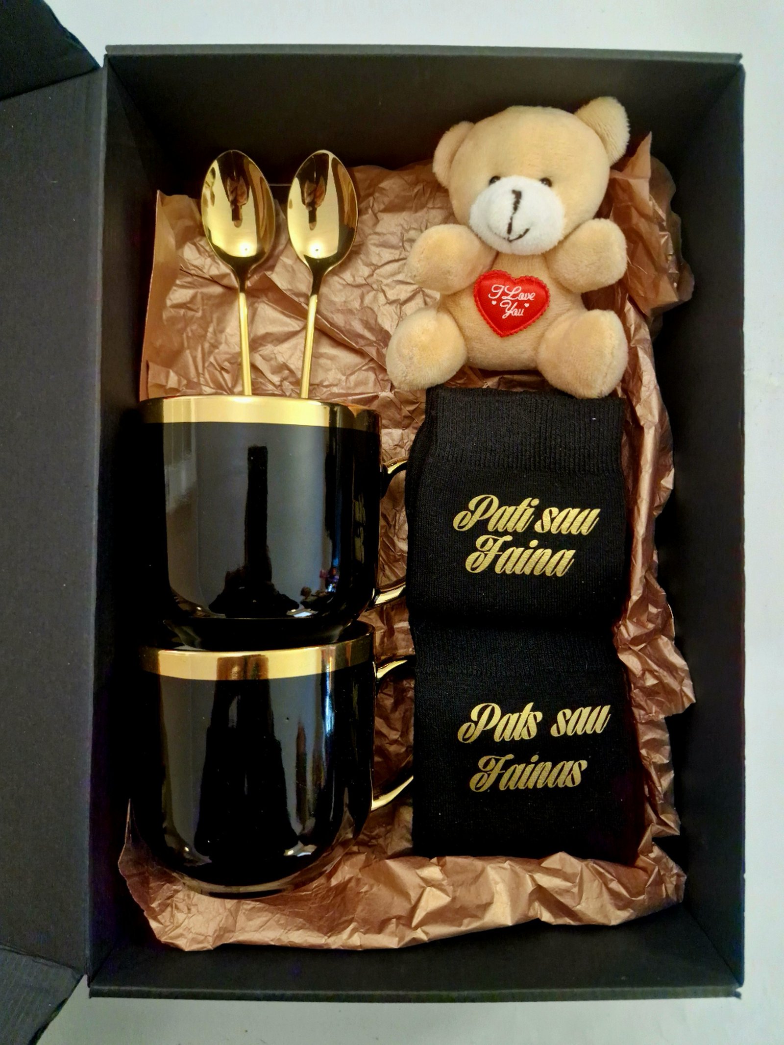 Rinkinį sudaro 2 puodeliai ir šaukšteliai, 2poros kojinių (37-40d. ir 43-42d.) bei meškutis.