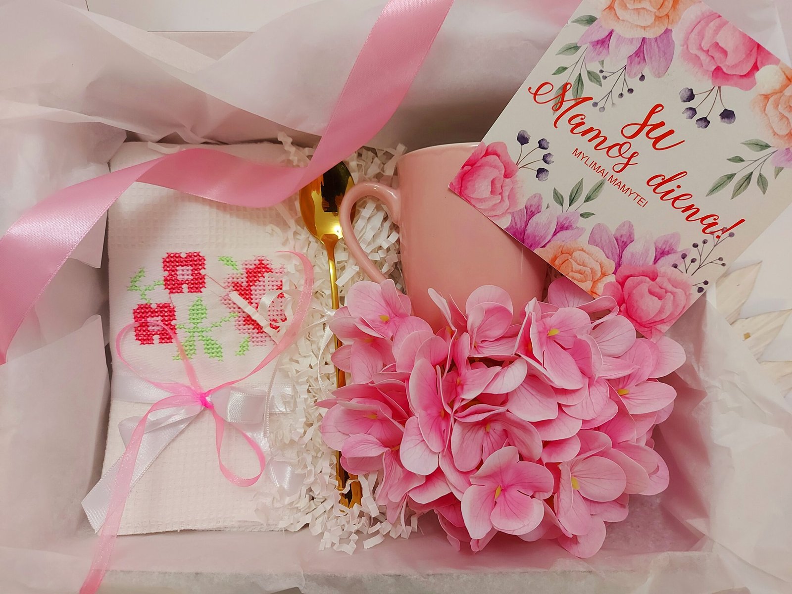 Rinkinį sudaro: siuvinėtas virtuvės rakšluostukas 62x43cm, rožinis puodelis 200ml, aukso spalvos šaukštelis bei itin kokybiškas dirbtinės gėlės žiedas.