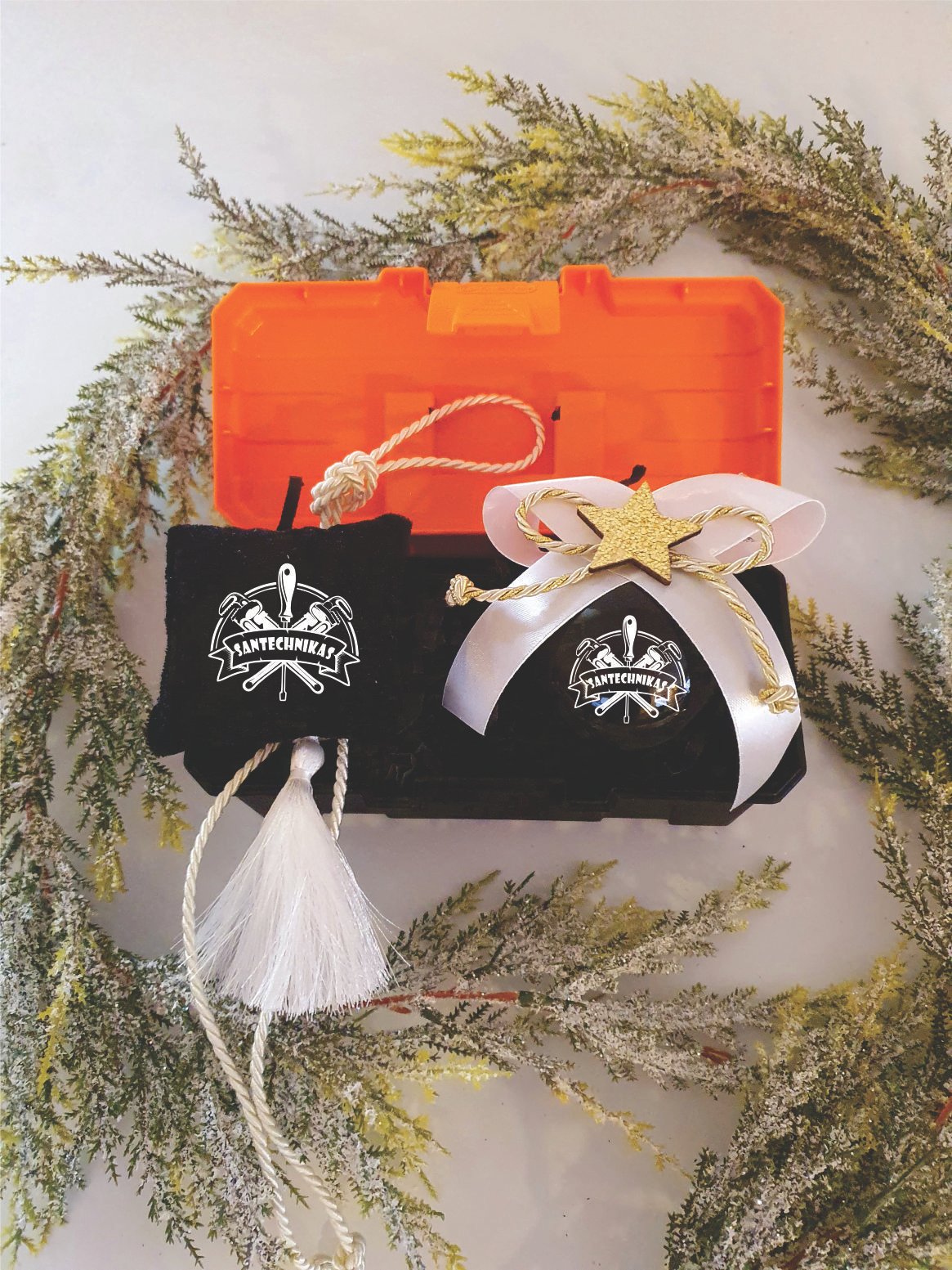 Rinkinį sudaro įrankių dėžutė, kalėdinis žaisliukas ir automobilinis pakabukas-kvapukas.