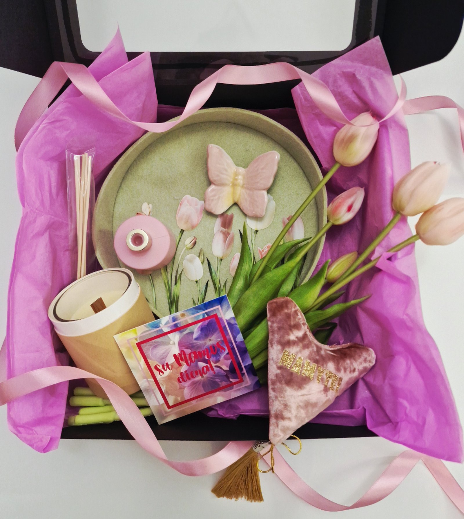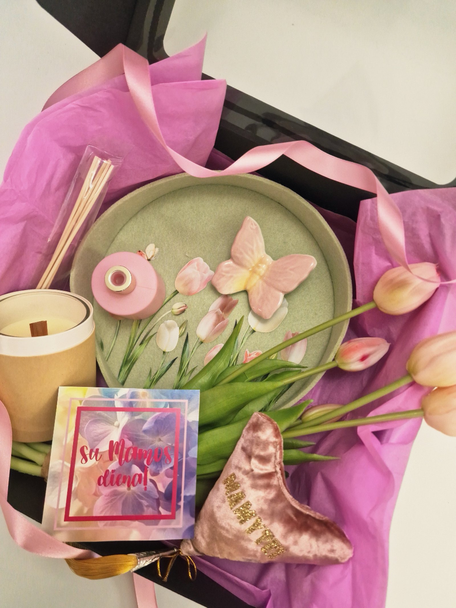 Rinkinį sudaro veltinio padėkliukas, žvakė, namų kvapas, itin aukštos kokybės silikoninės tulpės, barchato širdelė bei keramikinis drugelis.