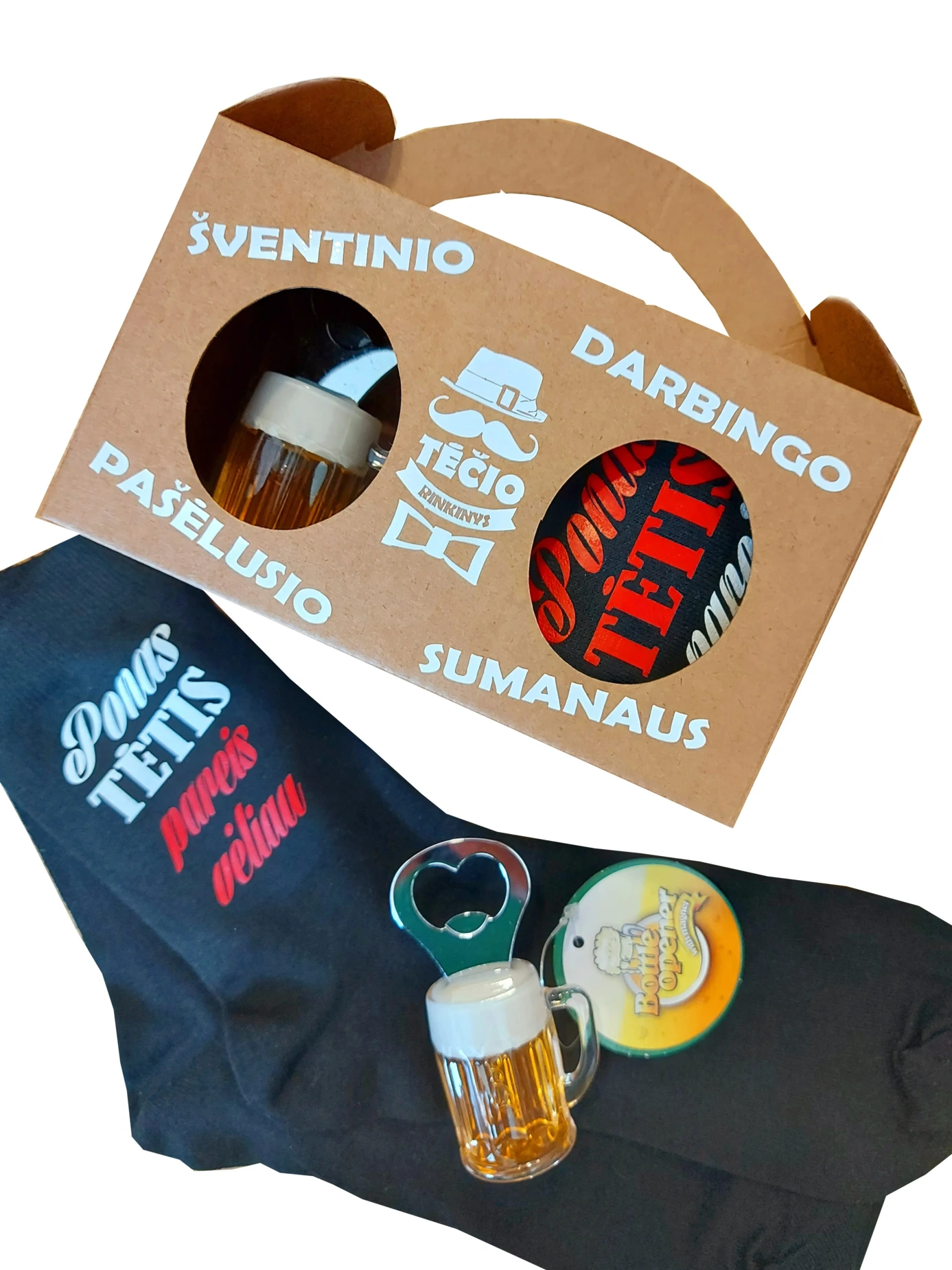 Rinkinį sudaro viena pora kojinių.Užrašas yra ant abiejų kojinių.