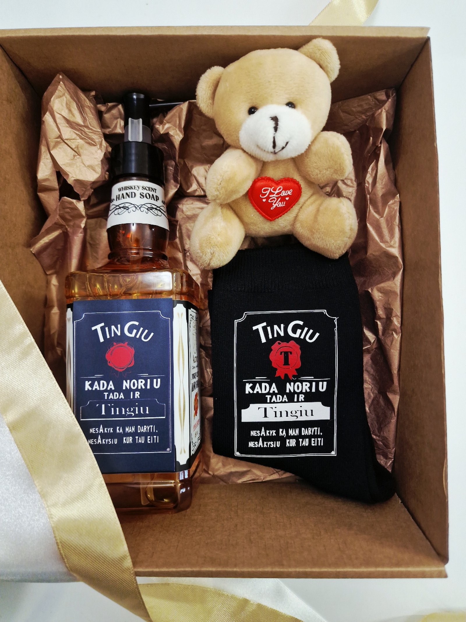 Rinkinį surado rankų muilas 480ml, mini meškutis bei kojinės.