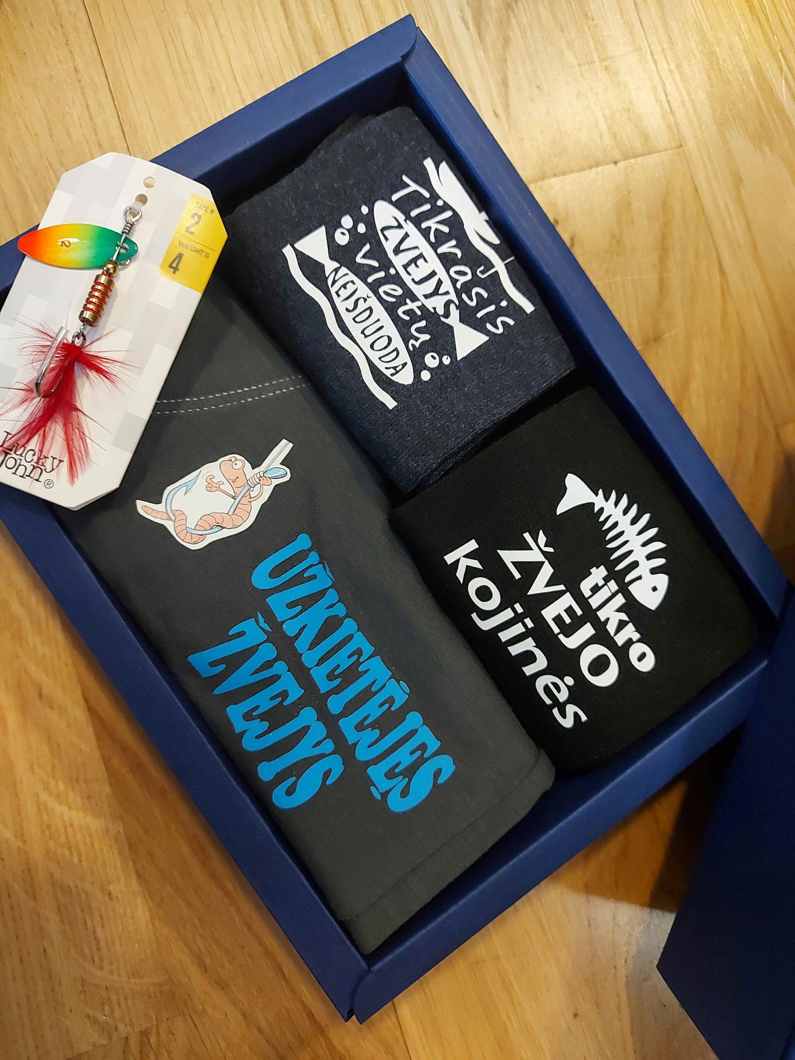 Žvejo rinkinys įpakuotas poierinėje mėlynoje dėžutėje. Tai viena iš geriausių dovanos idėjų.